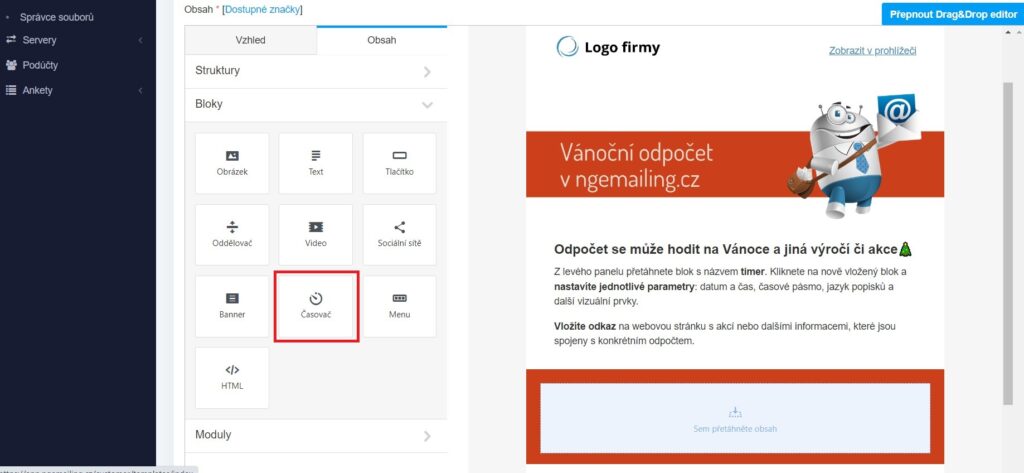 V editoru šablon si do obsahu e-mailu přetáhnete blok s názvem časovač.