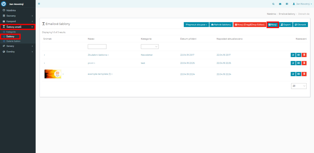 V tomto článku jsme si ukázali, jak pracovat s intuitivním Drag & Drop editorem. Nyní si ukážeme, jak vytvořit šablonu v klasickém, tedy WYSIWYG editoru nebo v HTML editoru. V menu si klikněte na šablony. Zde vyberete tlačítko +Nový (uprostřed).