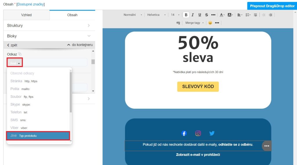 Pokud nevyužijete vestavěný Drag & Drop editor, ale šablonu importujete z jiného nástroje, jako je např. Beefree, je nabídka podobná. Označte vybraný text a vložte na něj odkaz, přičemž do kolonky URL vložte následující text: [UNSUBSCRIBE_URL].
